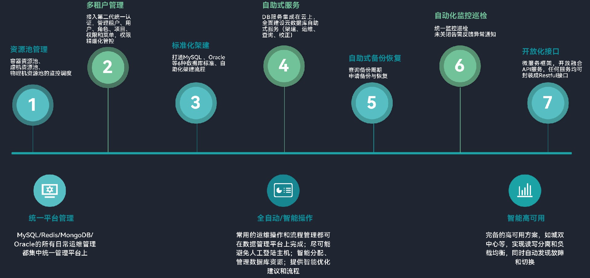 常用的运维操作和流程管理都可在数据管理平台上完成,尽可能避免人工登陆主机;智能分配、管理数据库资源;提供智能优化建议和流程。