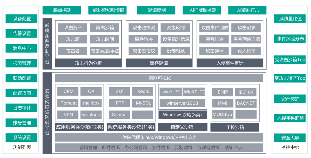 智能蜜网系统,通过一键检测企业内现有服务,加以安全算法编排,将中继节点、伪装代理迅速关联沙箱,同时实现自适应业务场景。